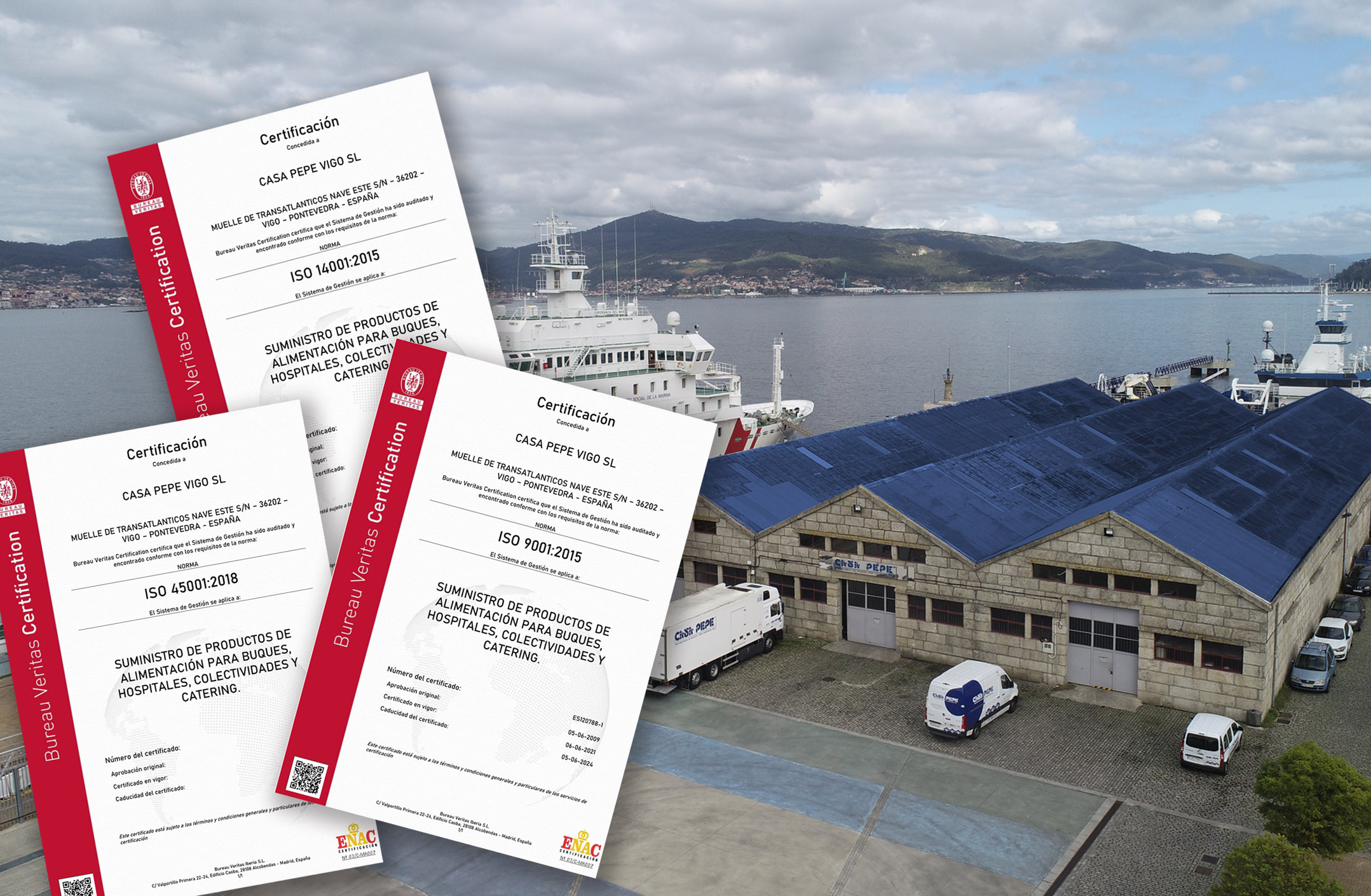 Casa Pepe renueva con Bureau veritas su certificación bajo las normas ISO 9001 :2015+14001:2015+45001:2018. El compromiso de la empresa viguesa ubicada en el Muelle de Trasatlánticos del Puerto de Vigo, ha sido siempre el de lograr el mayor grado de calidad en sus servicios y productos, lo que se ha visto amparado en el logro de las certificaciones de las normas de calidad. Estas certificaciones se unen a las logradas en meses anteriores como el Issa Quality Standard o empresa bien gestionada por ARDAN y constituyen un aliciente para propietarios y empleados para continuar en la senda de la mejora continua.